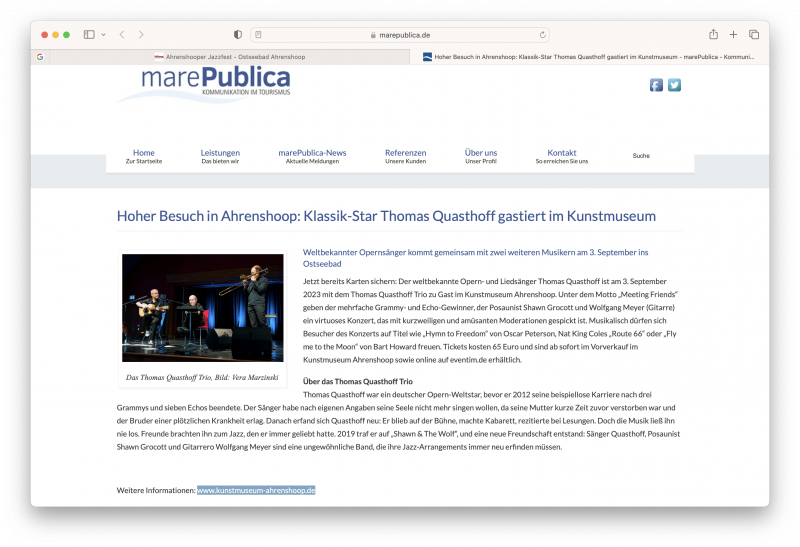 „Der weltbekannte Opern- und Liedsänger Thomas Quasthoff ist am 3. September 2023 mit dem Thomas Quasthoff Trio zu Gast im Kunstmuseum Ahrenshoop. Unter dem Motto „Meeting Friends“ geben der mehrfache Grammy- und Echo-Gewinner, der Posaunist Shawn Grocott und Wolfgang Meyer (Gitarre) ein virtuoses Konzert, das mit kurzweiligen und amüsanten Moderationen gespickt ist. Musikalisch dürfen sich Besucher des Konzerts auf Titel wie „Hymn to Freedom“ von Oscar Peterson, Nat King Coles „Route 66“ oder „Fly me to the Moon“ von Bart Howard freuen.“